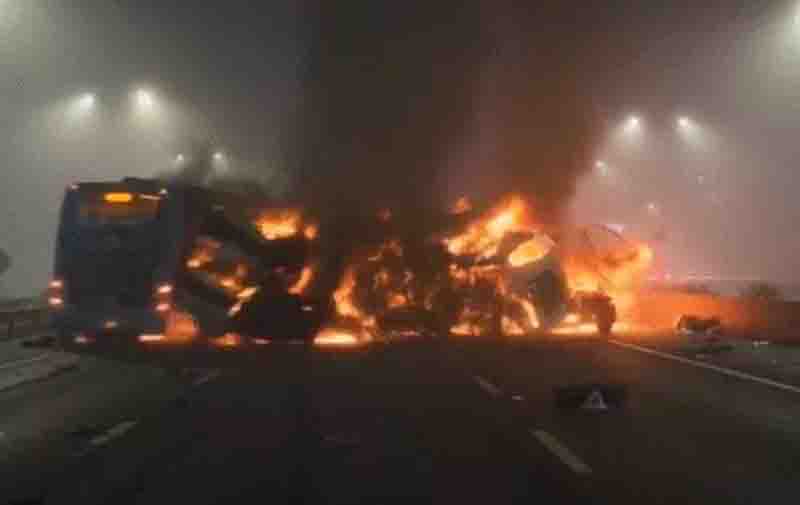 राष्ट्रमत न्यूज लखनऊ/ मथुरा(ब्यूरो)। मथुरा के एक्सप्रेस वे पर कोहरे की वजह से एक भीषण सड़क हादसा हुआ। आठ बसें और तीन कारें आपस में टकरा गयीं। टक्कर में भाजपा नेता समेत 13 लोगों की जलकर मौत हो गई। 70 लोग घायल हैं। घटना में मृतकों के शव के टुकड़े 17 पाॅलिथीन में ले जाया गया। इससे समझा जा सकता है कि हादसा कितना भयानक था। अब डीएनए टेस्ट से इनकी पहचान की जाएगी।