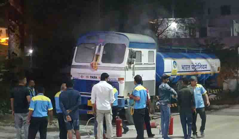 खड़े डीजल टेंकर में आग लगी,कैबिन से ड्राइवर को बाहर निकाला गया