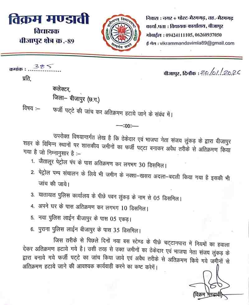 विधायक मंडावी ने भाजपा के वरिष्ठ नेता, जिला महामंत्री और ठेकेदार संजय लुंकड़ की जमीनों की गहन जांच की मांग की। उन्होंने आरोप लगाया कि संजय लुंकड़ (जो भाजपा नेता, जिला महामंत्री तथा ठेकेदार हैं) को निम्नलिखित जमीनें प्राप्त हुई हैं, नए पुलिस लाइन के पास 5 एकड़ जमीन, पुरानी पुलिस लाइन, एनएच के किनारे 35 डिसमिल जमीन, बीजापुर ट्रैफिक ऑफिस के पास परिजन के नाम पर 5 डिसमिल जमीन, जैतालुर पेट्रोल पंप के पास 30 डिसमिल जमीन, अपने निवास के पास 10 डिसमिल जमीन, पेट्रोल पंप खोलने हेतु 20 सूत्रीय जमीन (जो पहले एनएच से दूर पीछे की ओर थी, लेकिन एनएच पर दिखाकर पेट्रोल पंप स्थापित किया गया) उन्होंने सवाल उठाया कि भाजपा की डबल इंजन सरकार ने संजय लुंकड़ को ये जमीनें कैसे आवंटित कीं? इसके मानदंड क्या थे? सरकार इनकी गहन जांच कराए और जांच रिपोर्ट सार्वजनिक करे, ताकि बीजापुर वासियों को पता चले कि यहाँ जमीनों का अतिक्रमण, कब्जा एवं पट्टा किस आधार पर दिया जाता है।