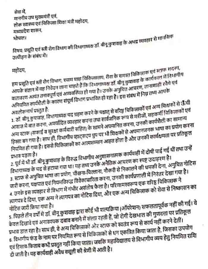 डाॅ बीनू कुशवाहा विभागाध्यक्ष पद ग्रहण करने के पश्चात् से वरिष्ठ चिकित्सकों एवं अन्य शिक्षकों से ऊँची आवाज में बात करना, अमर्यादित व्यवहार करना तथा सार्वजनिक रूप से मरीजों, सहकर्मी विकिलाकों पूर्व अन्य स्टाफ सफाई व सुरक्षा कर्मचारी सहित के सामने अपमानित करना उनकी कार्यशैली का सामान्य हिस्सा बन गया है। साथ ही विभागीय व्हाट्सएप ग्रुप पर भी शिक्षकों से अपमानजनक भाषा का प्रयोग करना नियमित हो गया। है। इससे चिकित्सकों का आत्मसम्मान आहत होता है और उनकी कार्यक्षमता पर प्रतिकूल प्रभाव पड़ता है।