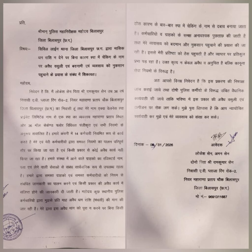 स्पा सेंटर संचालक ने लगाए गंभीर आरोप स्पा संचालक लोकेश सेन और उनके भाई अमन सेन का कहना है कि उनसे लंबे समय तक अवैध रूप से पैसे वसूले जाते रहे. उनका आरोप है कि प्रत्येक माह उगाही की रकम के भुगतान के बाद ही व्यवसाय चलाने की अनुमति दी जाती थी. जब एएसपी को यह रकम देना बंद कर दिया गया, तो उन्होंने उनके स्पा सेंटर जानबूझकर निशाने पर लिया था। उनके स्पा सेंटर में 6 जनवरी को फर्जी कार्रवाई के तहत छापा मारा गया था। लोकेश और अमन सेन का आरोप है कि उगाही बंद करने के बाद उनके स्पा सेंटर पर दबाव डालने के लिए एकतरफा कार्रवाई की गई थी,जिसका मकसद व्यवसाय को नुकसान पहुंचाना था। सोशल मीडिया में वायरल वीडियो पर क्या एक्शन होता है,यह वक्त ही बताएगा। लेकिन तब तक के लिए, वायरल वीडियो कई संदेहों को जन्म दे रहा है।