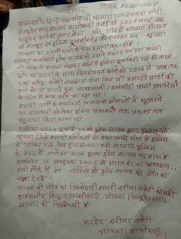 सुरक्षाबलों के बढ़ते दबाव और लगातार हो रहे मुठभेड़ से बौखलाए नक्सलियों ने एक बार फिर कायराना करतूत को अंजाम दिया है। हथियारबंद नक्सलियों बस्तर संभाग बीजापुर के उसूर थाना इलाके में एक भाजपा कार्यकर्ता की निर्मम तरीके से हत्या कर दी है। मृतक का नाम पूनेम सत्यम है। इस वारदात के बाद माओवादियों ने मौके पर पर्चे भी फेंके है जिसमें उन्होंने पूनेम पर पुलिस से मिलीभगत और नक्सलियों के मुखबिरी के आरोप लगाए है। पूरी घटना मुंजाल कांकेर की बताई जा रही है।आम ग्रामीणों को बना रहे है निशान।